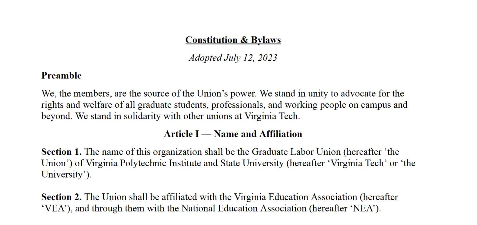We’ve got bylaws! Posted byVirginia Tech Graduate Labor UnionJuly 12, 2023August 31, 2023Posted inUncategorized We held a vote on them and now they’ve been accepted by the VEA! Read our bylaws below: vt-grad-union-constitution-and-bylaws-7-12-2023Download Like Loading... Related